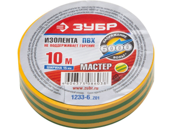 ЗУБР ЭЛЕКТРИК-10, 15 мм х 10 м, 6 000 В, желто-зеленая, не поддерживает горение, изолента ПВХ,Профессионал(1233-6) (Изолента). Санкт-Петербург