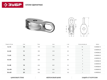Блок одинарный, нейлоновый шкив, 8x30мм, 6 шт, ЗУБР Мастер 4-304585-30. Корпус блока изготовлен из углеродистой стали, шкив изготовлен из нейлона Цинковое покрытие защищает от коррозии и продлевает срок службы изделия Применяется для изменения направления движения каната и увеличения силы в грузоподъемном оборудовании. Блоки одинарные с нейлоновым шкивом применяются для неметаллических канатов. Техническая таблица. Такелажный крепеж Листовка. Такелажный крепеж 304xx-xx