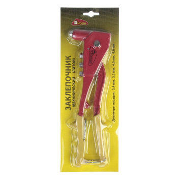 Описание: Заклёпочник механический с насадками для заклепок диаметром 2,4 мм, 3,2 мм, 4 мм, 4,8 мм. Стальной штампованный рычаг, пластиковые рукоятки. Длина: 230 мм. Материал: Металл, пластик. Корпус штампованный. Тип: механический(литой). Заклепочник оснащен ПВХ рукоятками с местом для крепления ключа для замены насадок.
