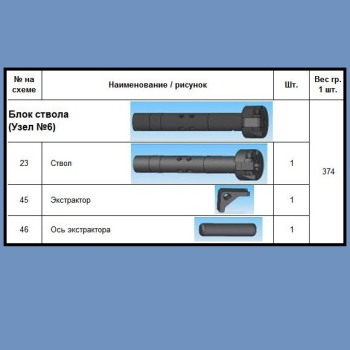 Блок Ствола (узел 6) - для монтажного пистолета ПЦ-84, GFT5, МЦ-52 (позиция в схеме: 23-ствол, 45-экстрактор, 46-ось экстрактора). Ствол - дорогая запасная часть, в стволе износ появляется в канале и патроннике (казённике). При выстреле монтажного патрона, поршень размещённый в канале ствола перемещается пороховыми газами на 45 мм. Часто в целях экономии используют дешёвые патроны с тонкой стенкой, в таких патронах стрелянная гильза плотно застревает в патроннике ствола. Выковыривание таких гильз, зачастую приводит к преждевременной замене ствола.Вес Блока Ствола: 374гр.