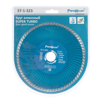 Описание: Диск алмазный РемоКолор professional SUPER TURBO 230х22,2 мм 37-1-323 - алмазный диск для широкого спектра действия. Применяется для сухого реза кирпича, бетона, натурального и искусственного камня. Способен разрезать тонкую арматуру в бетоне. Высокая скорость резания и продолжительность работы. 30% алмазной крошки в составе связки. Высота сегмента - 7 мм. Посадка 22,2 мм. Переходное кольцо в комплекте. Сухой рез. Охлаждение водой увеличивает ресурс диска.