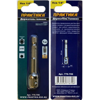 Адаптер ПРАКТИКА квадрат 3/8" для головок, длина 65 мм, хвостовик шестигранник 1/4" (776-706) Держатели предназначены для быстрой смены головок с посадкой внутренний квадрат при работе шуруповертом. Изготовлены из высококачественной инструментальной стали твердостью HRC 48- 52 с фиксацией головки шариком.