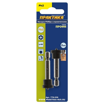 Бита отверточная ПРАКТИКА "Профи" PH-2 х 50мм для гипрока, с ограничителем (2шт.) (776-539) При работе аккумуляторными и сетевыми дрелями не имеющими специальных ограничителей поглубине завинчивания часто происходит чрезмерное утапливание головки шурупа. При монтаже ГКЛэто приводит к существенному ослаблению крепления листа, или порче деревянной поверхностипри работе с мягкой древесиной. При отсутствии шуруповерта с муфтой расцепления оптимальноиспользовать насадки с ограничителем завинчивания саморезов заподлицо с поверхностью. Приэтом даже пользователь с небольшим опытом работы сэкономит много времени при массовомзавинчивании шурупов. Также существенно повышается качество и внешний вид соединения.