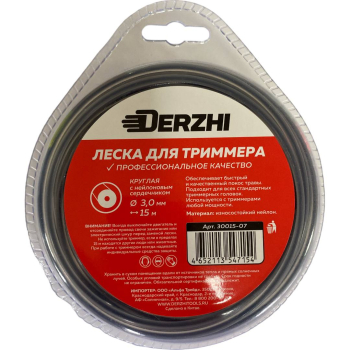 Леска для триммеров Derzhi, с нейлоновым сердечником круглая, 3 мм, 15 м, блистер