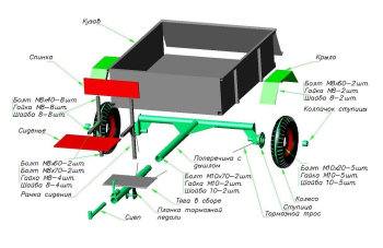 Тележка прицепная DDE (складная, г/п 400кг, кузов 1300x1100x350) разгрузка - способом опрокидывания, тормоза - ленточные — тележка к мотоблокам "НЕВА" МБ-2, МБ-1, "САЛЮТ", "АГРОС", "ОКА", "КАСКАД" Тележку к мотоблокам можно использовать для перевозки различных сыпучих, длинномерных, штучных грузов. Разгрузку с тележки можно осуществлять способом опрокидывания кузова в сторону заднего борта. Технические характеристики -Грузоподъемность - 400 кг -Собственная масса - 100 кг -Габариты кузова - 1300х1100х350 -Колеса - 5.00х10 или 4.00х10 -Тормоза: ленточные с механическим ножным приводом Подготовка к работе 1. Порядок сборки 2. Перевернуть кузов тележки днищем вверх. 3. Закрепить поперечину с дышлом на кузов тележки через три втулки при помощи осей и зашплинтовать. 4. Установить тягу в сборе в поперечину с дышлом и закрепить при помощи болтов М10х70 и гаек М10. 5. Вставить тормозной трос в паз планки тормозной педали. 6. Отрегулировать натяжение троса регулировочными болтами на концах троса. 7. Установить крылья на кузов и закрепить при помощи болтов М8х60 и гаек М8. 8. Установить колпачки ступиц (2 шт.). 9. Установить колеса на ступицы и закрепить болтами М10х20 (10шт) и гайками М10 (10шт). 10. Перевернуть тележку на колеса. 11. Закрепить сиденье и спинку на рамки сиденья винтами М8х40 (8 шт.) и гайками М8 (8 шт.), не затягивая крепежные винты гайками. 12. Установить сиденье на кузов и закрепить болтами М8х60 и М8х70 и гайками М8. 13. Произвести затяжку винтов и болтов сиденья и спинки.