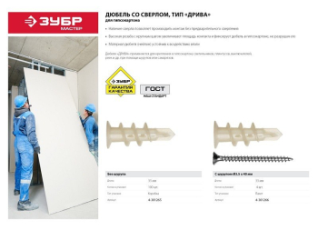 Дюбель ЗУБР Мастер нейлоновый, тип "Дрива" со сверлом, для гипсокартона, 33 мм, 100 шт Дюбели ДРИВА для гипсокартона изготовлены из высококачественных материалов и используются для крепления различных элементов и конструкций к несущему основанию. Находят широкое применение в быту для крепления различных легковесных элементов и конструкций. Наличие сверла позволяет производить монтаж без предварительного сверления Высокая резьба с крупным шагом увеличивает площадь контакта и фиксирует дюбель в гипсокартоне, не разрушая его. Широкий диапазон рабочих температур благодаря высокой пластичности нейлона: от -40?С до +80?С Нейлон устойчив к воздействию влаги, что позволяет использовать дюбели при выполнении наружных работ