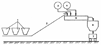 Рис. 5. Схема установки для приготовления эмульсионно-минеральных смесей: 1. Дозаторы минеральных материалов. 2. Транспортер. 3. Емкость для воды. 4. Емкость для эмульсии. 5. Смеситель двухвальный непрерывного действия. 6. Накопительный бункер. 7. Автомобиль-самосвал