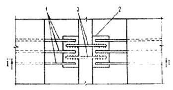 Черт. 2. Стык элементов самонапряженных железобетонных конструкций, работающих на растяжение (распределительная арматура и анкера закладных деталей условно не показаны)