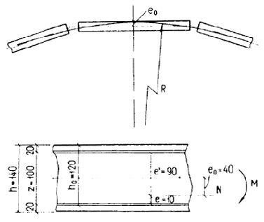 Пример 1. Расчет стенки круглого резервуара для воды. Резервуар представляет собой цилиндрическую (полигональную) емкость, заполненную водой; D = 24 м; Н = 3,6 м. Стенка из плоских панелей шириной 2,3 м (самонапряженные). Сопряжение с днищем ¾ жесткое (заделка). Расчетная зона панели находится на расстоянии 0,4Н от днища. Растягивающее усилие N = 200 кН/м. Изгибающий момент в середине панели (вследствие полигональности, т. е. несоответствия оси стены окружности емкости) М = 8 кН × м (черт. 1).