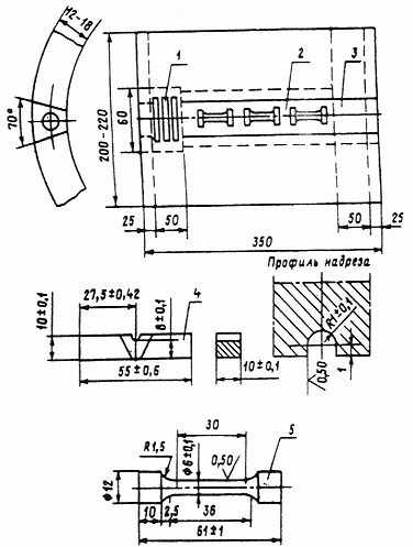 Рис. 3.2. Схема вырезки образцов для испытания металла шва: 1 -заготовка под образцы для испытания на ударный изгиб; 2 - заготовка под образцы для испытания на растяжение; 3 - заготовка под пробы для химического анализа; 4 - образец для испытания на ударный изгиб (тип VI по ГОСТ 6996-66); 5 - образец для испытания на растяжение (тип II)