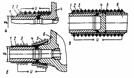1 - труба, 2 - теплоизоляция, 3 - первый (внутренний) слой индуктора, 4 - асбоцементная прокладка, 5 - второй (наружный) слой индуктора, 6 - корпус задвижки; в - соединение трубы с заглушкой: 1 - труба, 2 - теплоизоляция, 3 - индуктор, 4 - заглушка, 5 - временные прихватки,