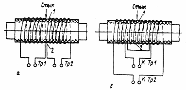 а - два шестивитковых односекционных индуктора; б - односекционный шестивитковый и двухсекционный (по три витка в секции) индукторы; 1, 2 - места расположения термоэлектрических преобразователей