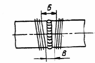 Для нагрева сварных соединений штуцеров малого диаметра (не более 100 мм) с коллекторами диаметром 219-325 мм гибкий кабель наматывают по схеме, приведенной на рис. 15.4, б, при этом от одного трансформатора ТДФЖ-2002 одновременно можно нагревать два соединения. На штуцер диаметром менее 76 мм следует наматывать четыре витка кабеля, на штуцер большего диаметра - пять витков. Для размещения витков на штуцере его обертывают утолщенной асбестовой изоляцией в несколько слоев.