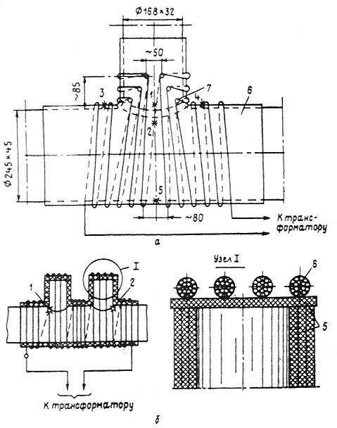 Рис. 15.5. Схемы подключения индукторов при нагреве стыка труб диаметром 980 мм: