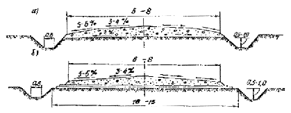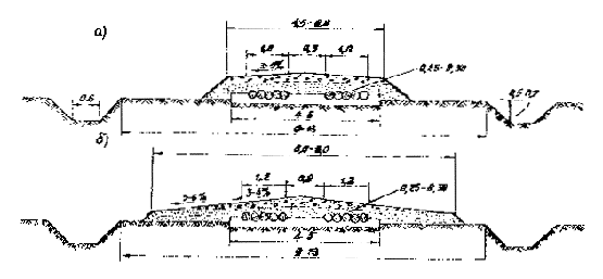 Рис. 8. Схемы насыпей на участках со слабым основанием в лесных районах при ширине дороги 4,5-6 м (а ) и 6-8 м (б )