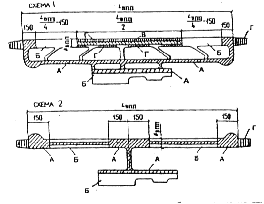Рисунок 3 — Схемы деления покрытий аэродрома на группы участков: схема 1 — для аэродромов, на которых руление воздушных судов осуществляется по магистральной РД; схема 2 — для аэродромов, на которых руление воздушных судов осуществляется по ИВПП