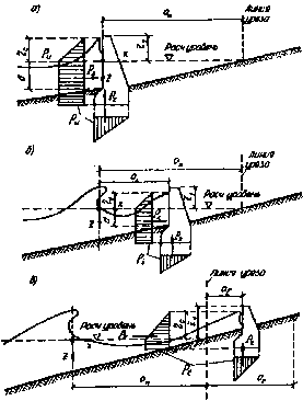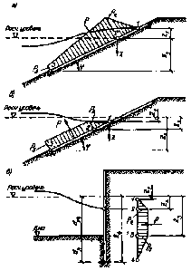 а - при накате волны на откос; б - при откате волны с откоса; в - при ложбине волны у верт ик альной стены